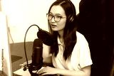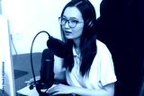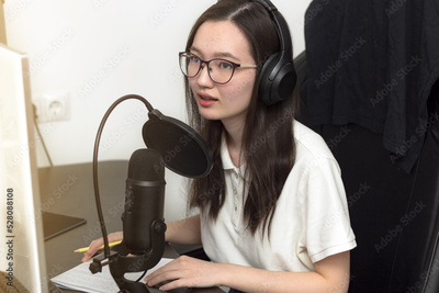 Young woman with glasses, microphone and headphones recording podcast at studio, professional record audio, technology and media concept