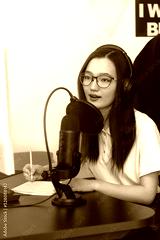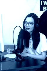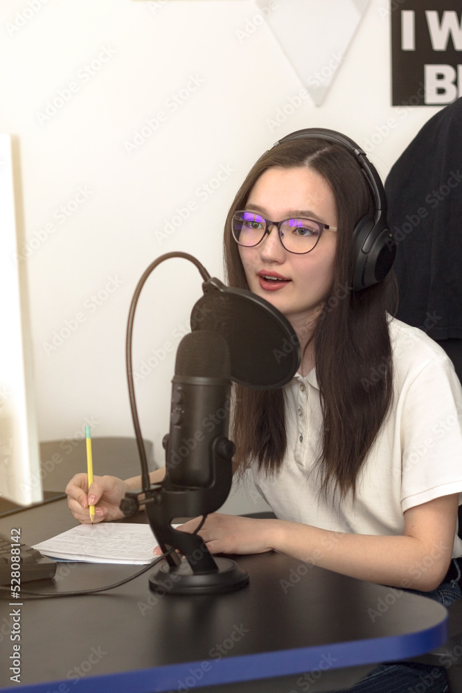 Young woman with glasses, microphone and headphones recording podcast at studio, professional record audio, technology and media concept, vertical image