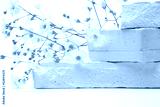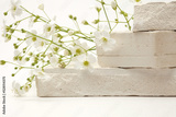 Empty stack of stones and flower platform podium on beige background. Minimal empty display product presentation scene.