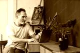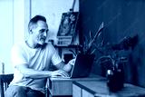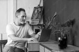 Portrait profile of handsome mature bearded man using laptop typing and checking data on screen. MIddle-aged manager working at home sitting at desk