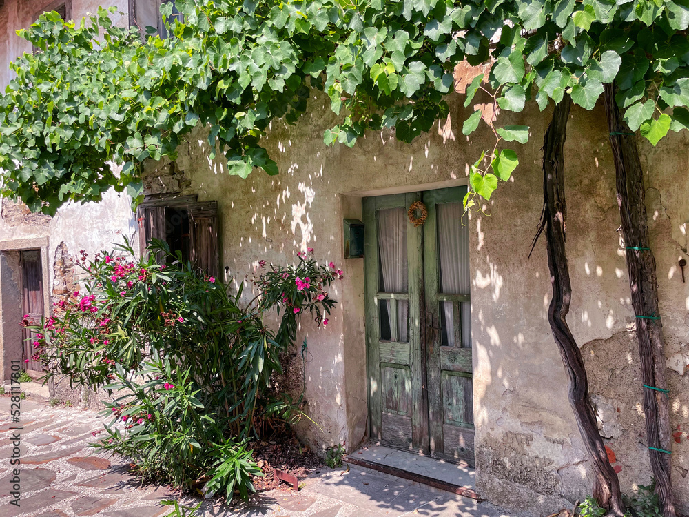 Green doors of an old monumental house circled with grapevine and rhododendron