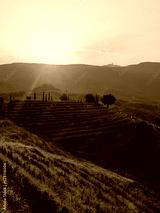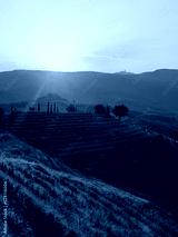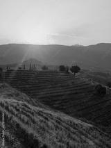 Magnificent terraced vineyards illuminated with golden sunrise on autumn morning