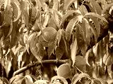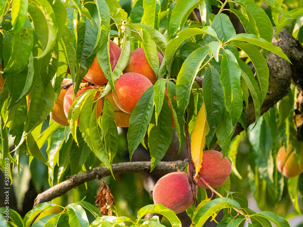 CLOSE UP: Peach tree branch filled with ripe peaches waiting for autumn harvest