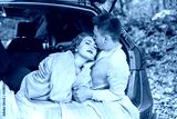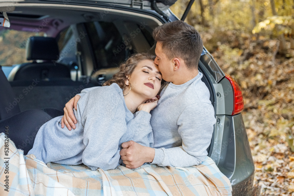 Boy and girl are hugging in trunk of car. Autumn forest. Couple in love. Romantic date.