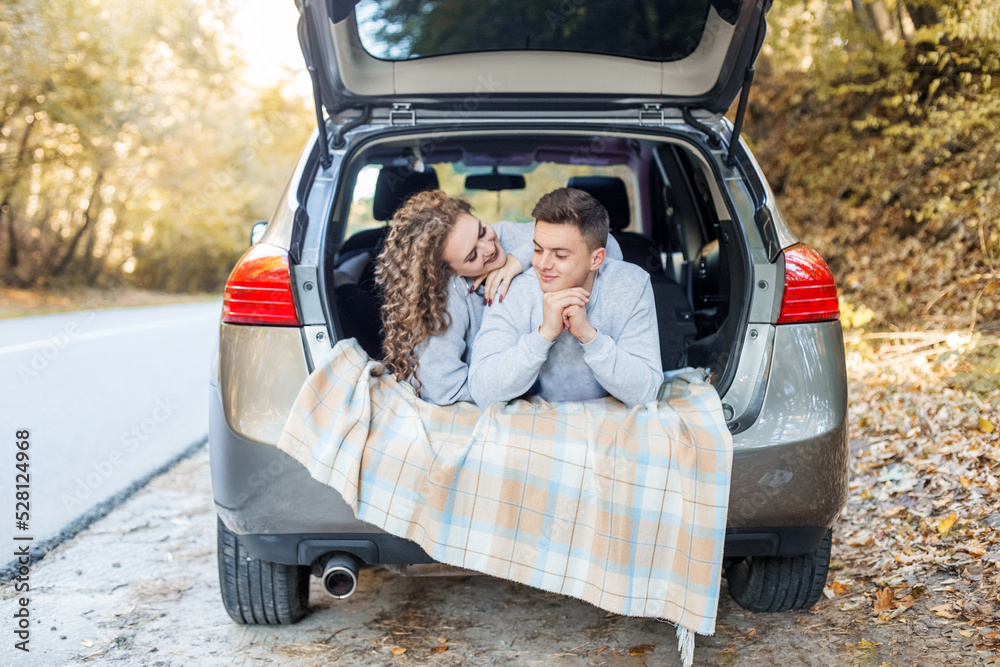 Boy and girl are hugging in trunk of car. Autumn forest. Couple in love. Romantic date.