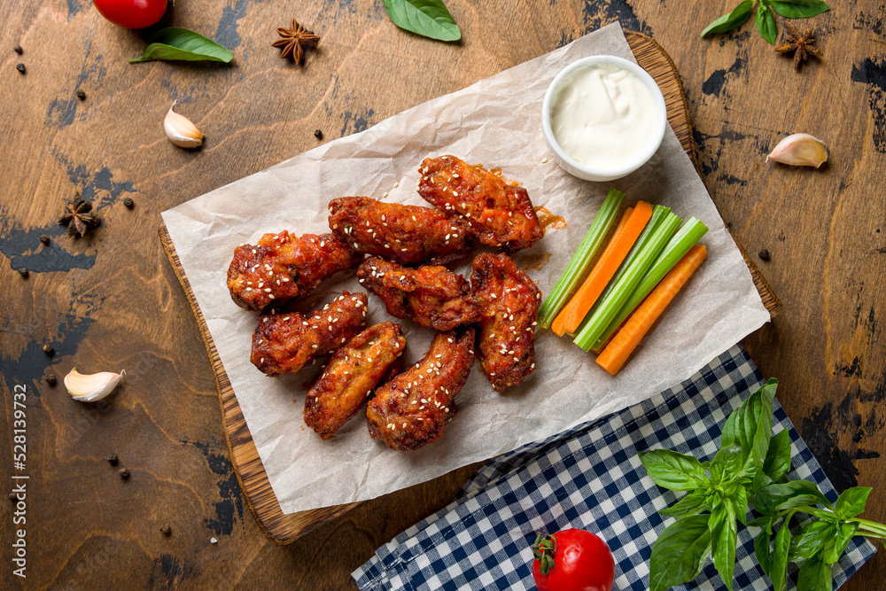 Chicken wings with blue cheese sauce and carrot and celery sticks on the board on brown wooden table top view