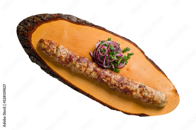 Lula kebab chicken with red onion on wooden board isolated on white background top view