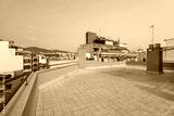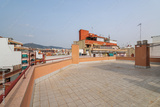 Empty common terrace on the roof of a building in Barcelona, Spain. View to the city and blue sky on sunny day.