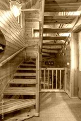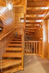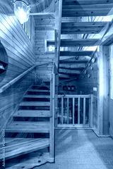 Wooden stairs in a small country house. Hallway of cozy house in a village.