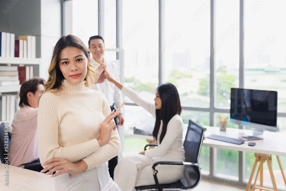Young Asian female worker staff with colleagues male and female group coworker in casual working at workspace office, Back to the office concept