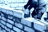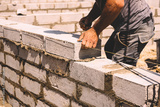 Professional construction worker laying bricks and mortar - building external house walls. Construction site detail -closeup of hand adjusting bricks