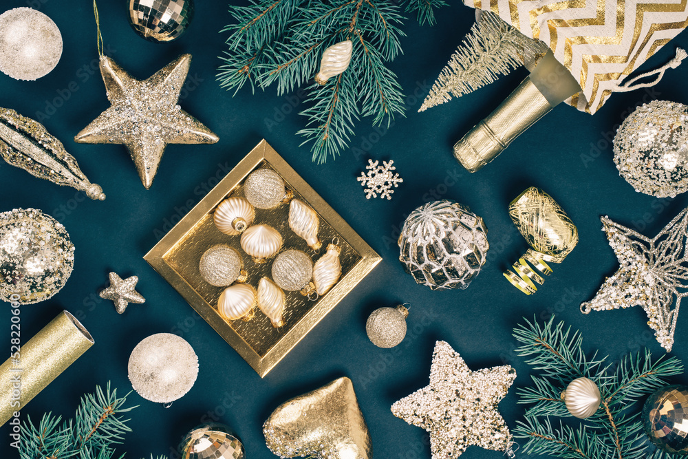 Merry Christmas and Happy New Year rich golden and crystal baubles festive ornaments. stars glitter and Christmas tree branches with cones on teal green. Party decor banner. Top view full frame
