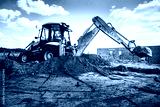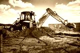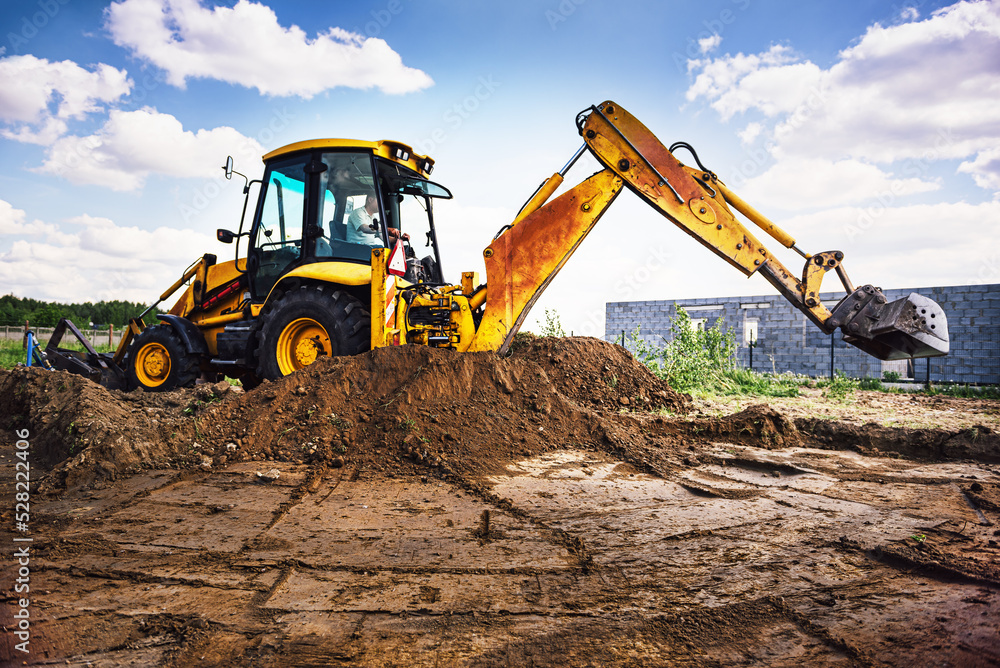 Excavator working at house construction site - digging foundations for modern house. Beginning of house building. Earth moving and foundation preparation.