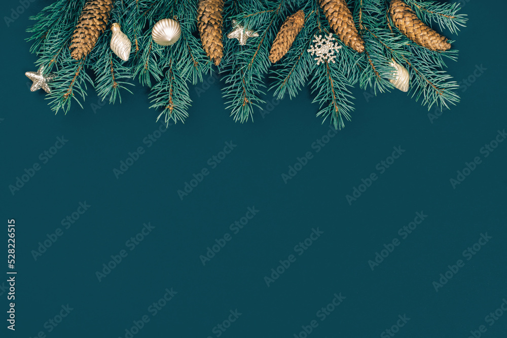 Merry Christmas and Happy New Year rich golden and crystal baubles festive ornaments garland. Top border Christmas tree branches with cones on teal green. Party decor banner. Top view