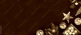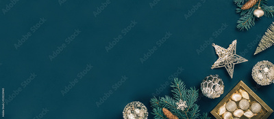 Merry Christmas and Happy New Year rich golden and crystal baubles festive ornaments. stars glitter and Christmas tree branches with cones on teal green. Party decor corner banner. Top view