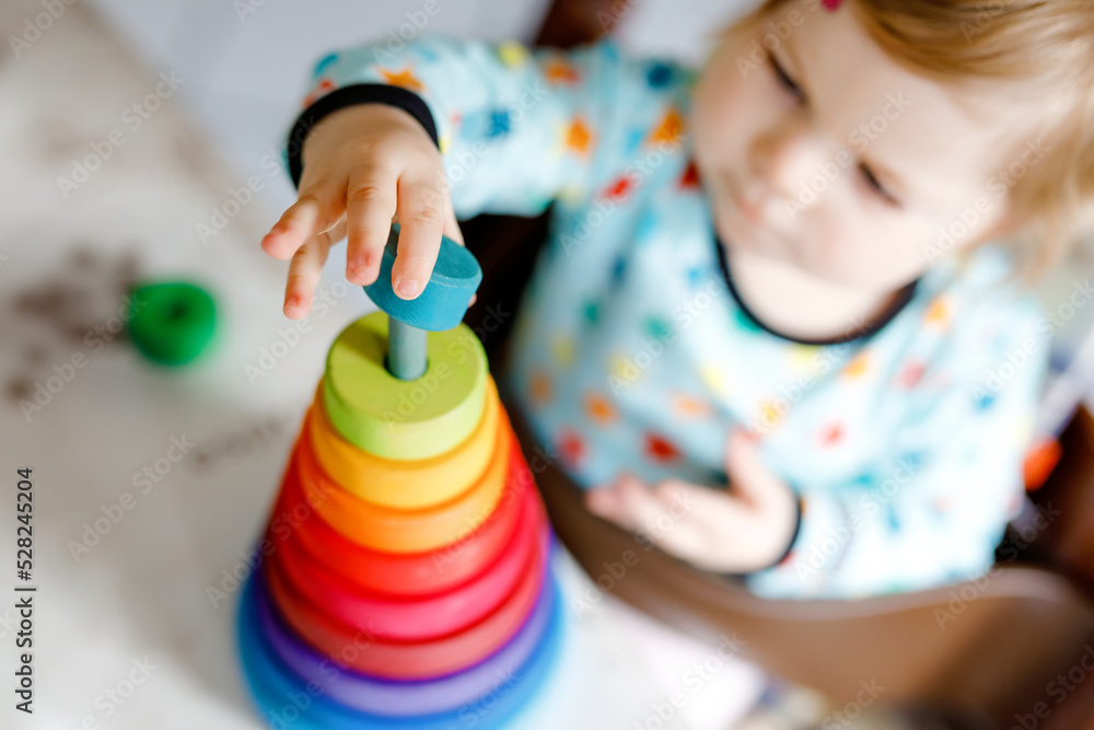 Cute beautiful little baby girl playing with educational toys at home or nursery, indoors. Happy healthy child having fun with colorful wooden rainbow toy pyramid. Kid learning different skills.