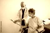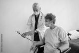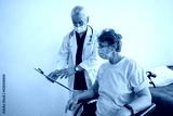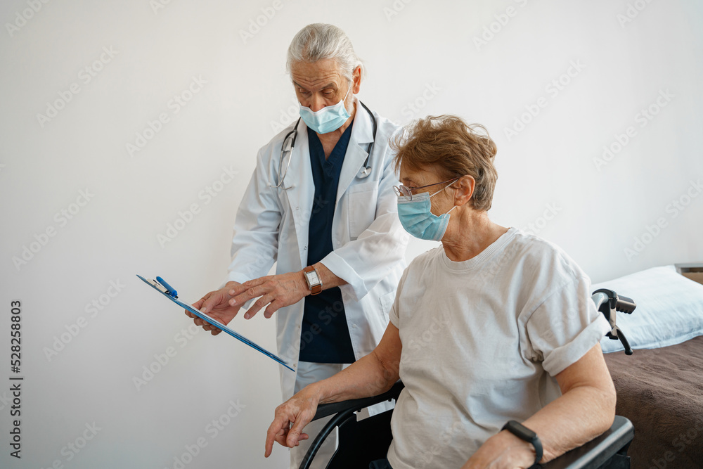 Doctor in mask explaining to a sick patient in wheelchair details of treatment. High quality photo