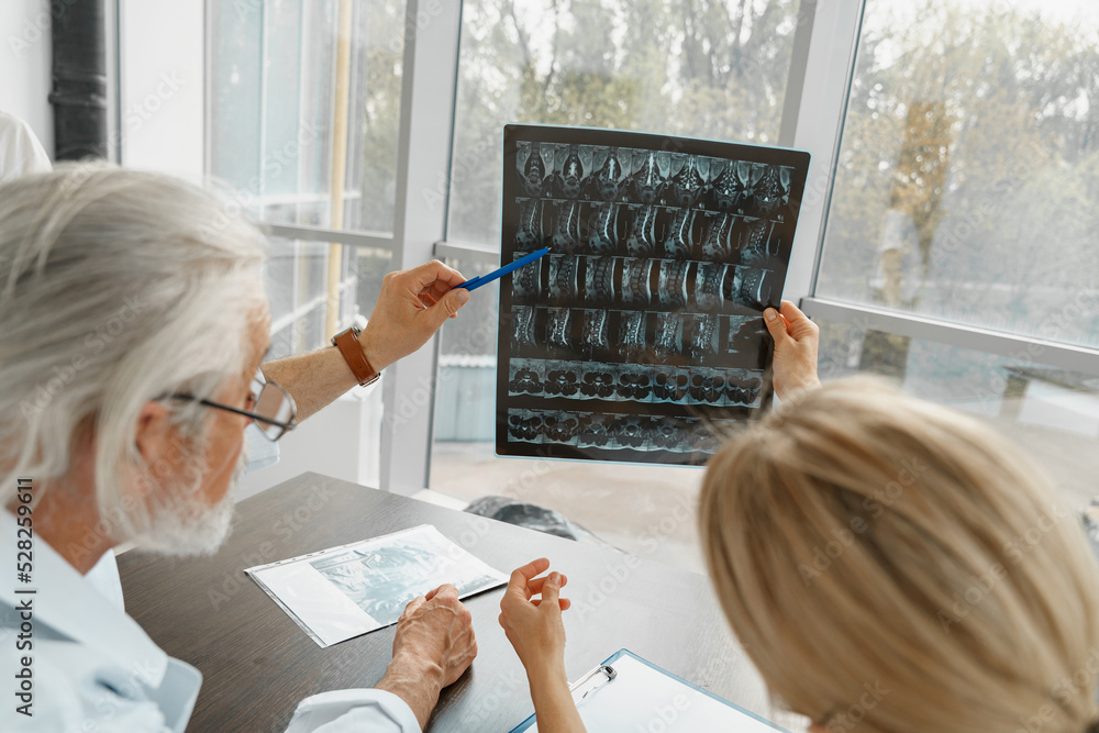 Team of doctors discuss results of X-Ray or MRI scan of patient's spine in medicine office
