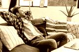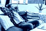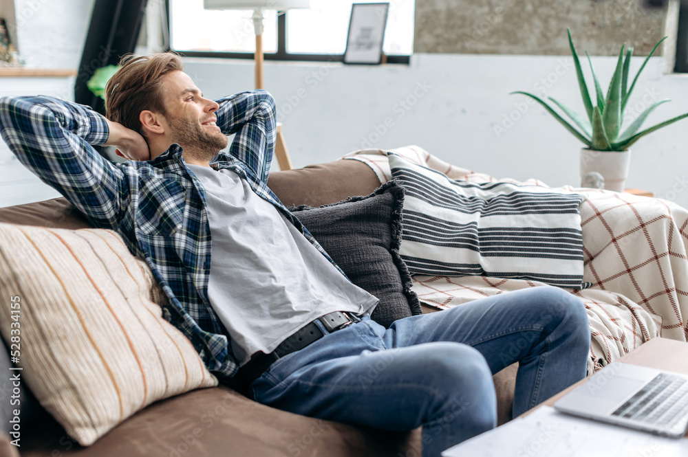 Relaxation at home. Satisfied positive calm stylish caucasian young man, resting at home after a working day, sitting on a comfortable sofa, throwing his hands behind his head, looking away, smiling