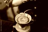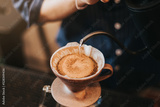 Professional barista making filtered drip coffee in coffee shop. Close up of hands barista brewing a drip hot espresso coffee, pour over coffee with hot water and filter paper in coffee cafe.