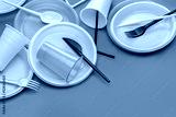 A set of multi-colored plastic utensils on a gray background, top view.