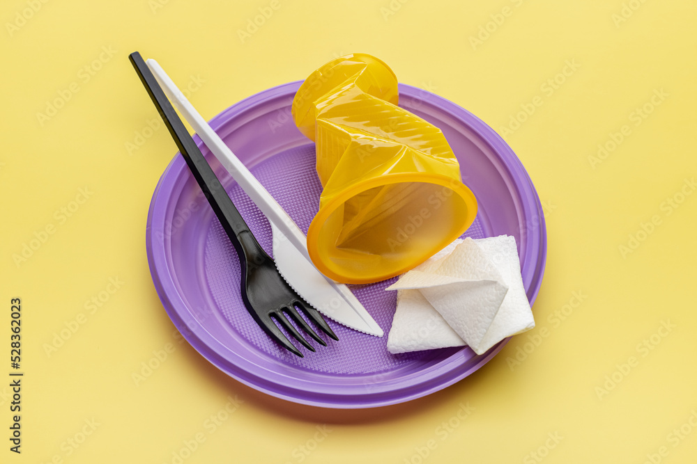Used plastic. Disposable purple plates, crumpled yellow cup, knife, fork and napkin. The concept of ecology and recycling.