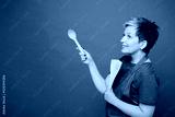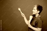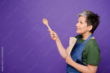 Smiling mature attractive gray-haired woman with wooden spoon pointing index aside up on copyspace isolated on violet color background. Middle aged woman cooker in apron showing notes instruction