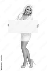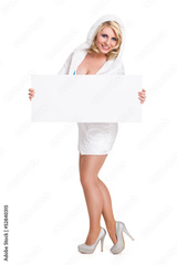 attraktive blonde Frau mit Kapuzenkleid und Schild