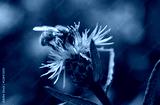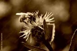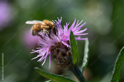Close-up of a small honey bee against the light. The bee is looking for food and pollen on a purple wildflower. The background is green with light reflections