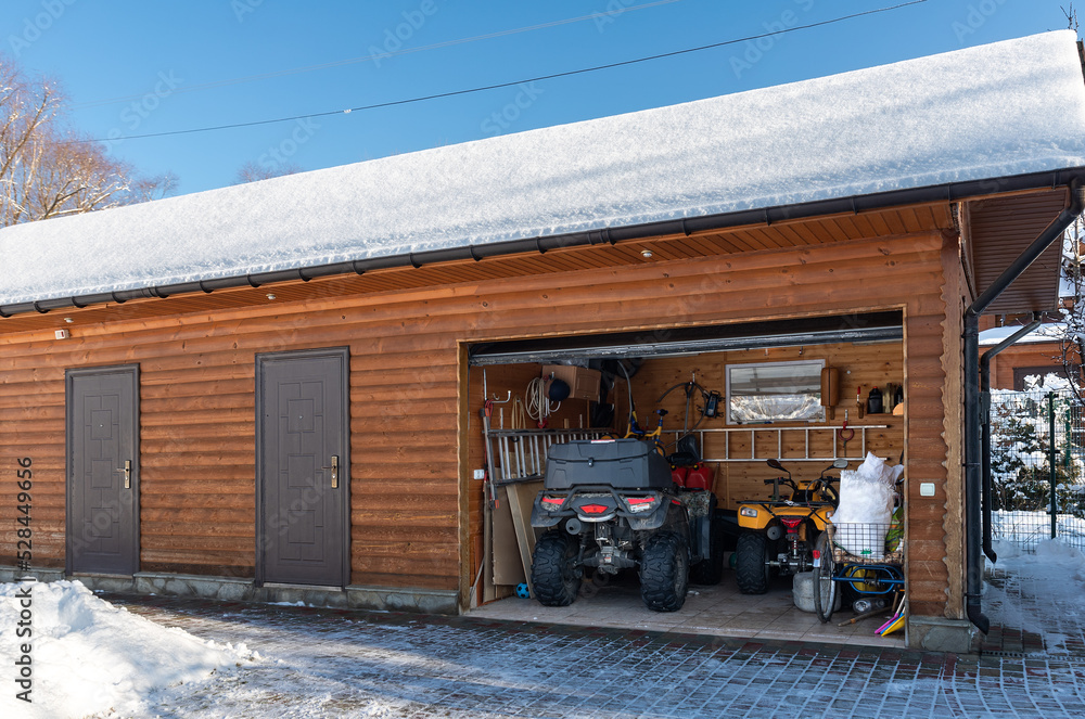 Facade view open door ATV home garage with quad bikes offroad vehicle parked sunny snowy cold winter day. ATV adventure extreme sport. House organized clutter warehouse tools equipment shed storage