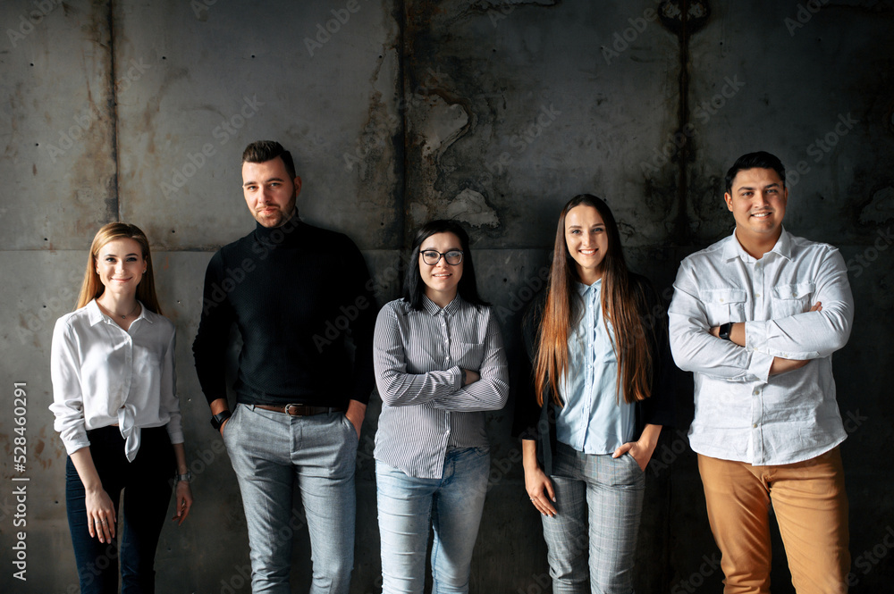 Woman boss with her subordinates. A woman with arms crossed stands with her subordinates on the sides. She is young and confident