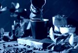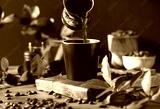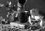 Coffee is poured into a black mug from a metal cup on a dark background.