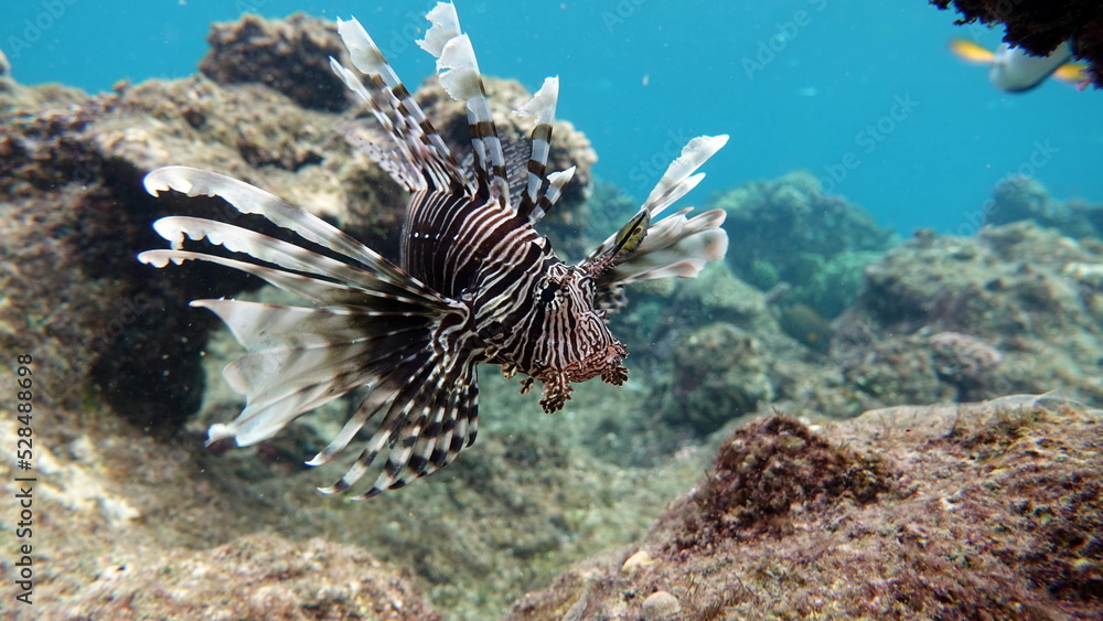 Lion Fish in the Red Sea in clear blue water hunting for food .