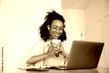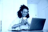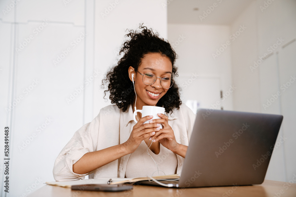 Black woman in earphones drinking coffee while working with laptop