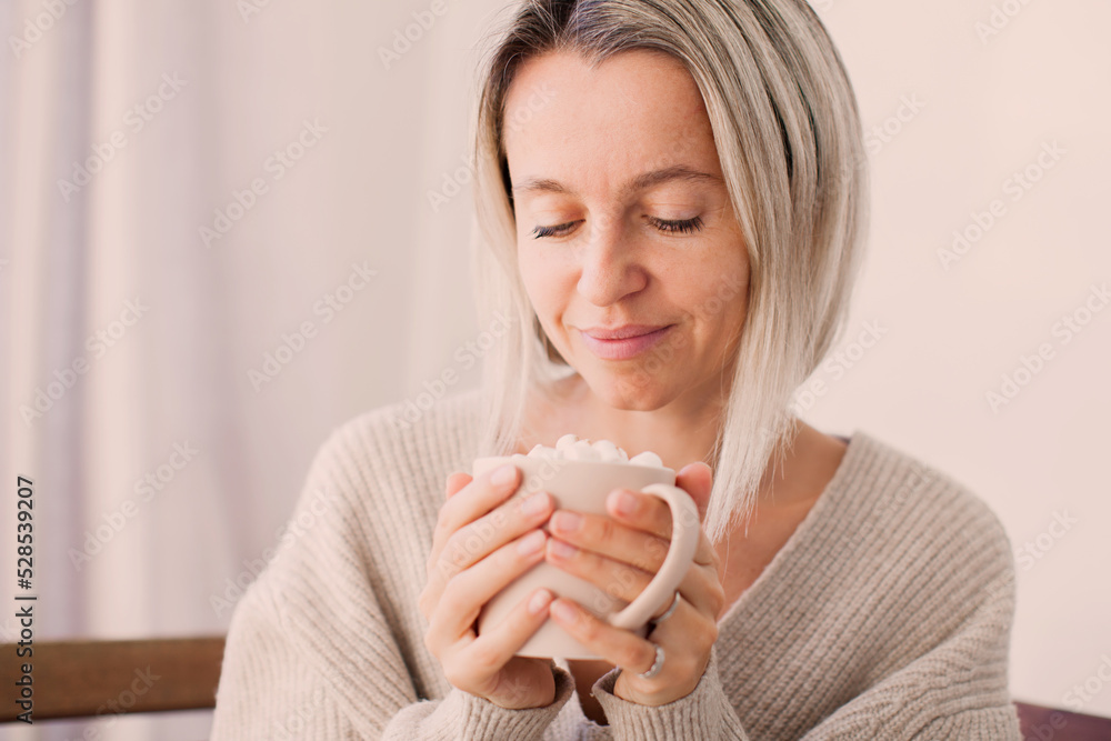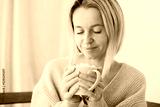 Happy dreamy middle aged woman sitting on sofa in living room with cup of tea or coffee