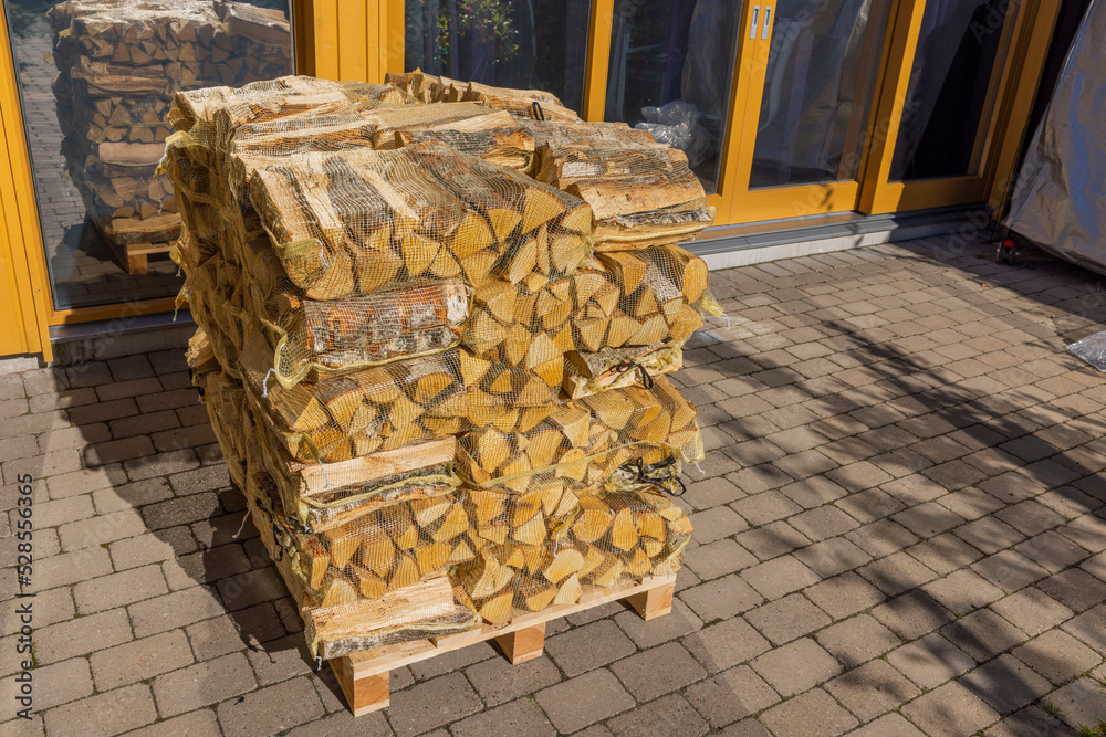 Close up view of birch firewood in transport nets on pallet in front of exterior facade of modern villa. Sweden.