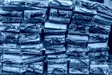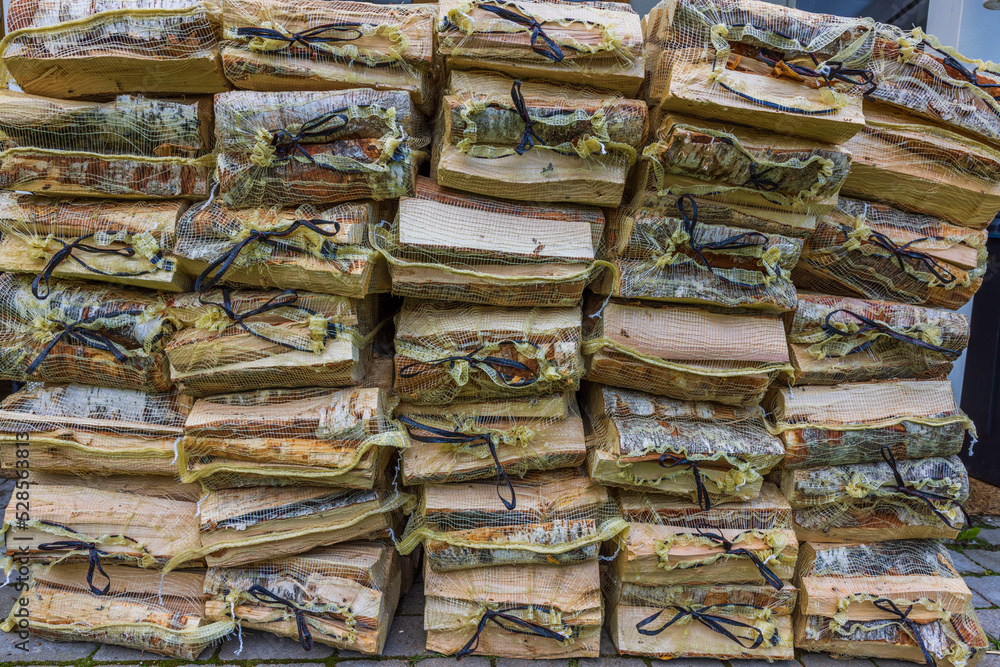 Close up view of birch firewood in transport nets. Natural texture background. Sweden.
