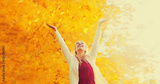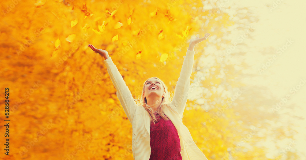 Happy smiling woman having fun with flying yellow leaves in autumn park