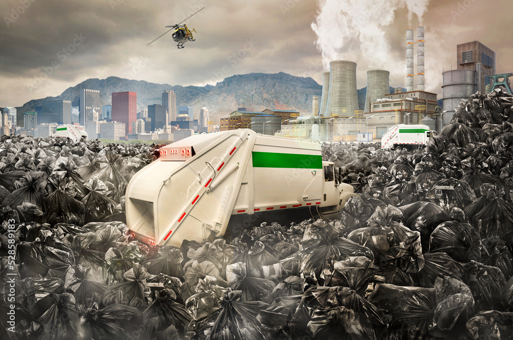 A large pile of junk on the background of the city symbolizes global pollution