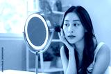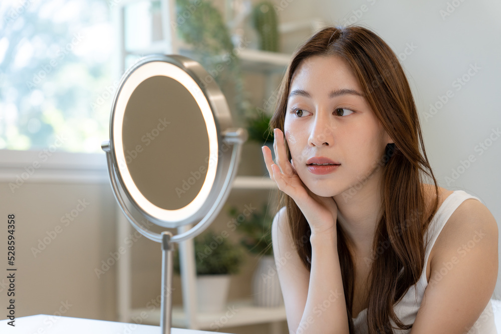 Beautiful Asian woman sitting in front of mirror. face of healthy woman applying cream and makeup. Advertisement for skin cream, anti-wrinkle cream, baby face, skin care, Moisturizing Cream,foundation