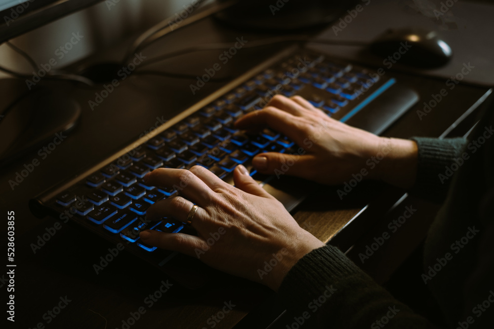 Woman Hands working on keyboard. Evening light. Freelancer doing her work at home. IT specialist writing letter or coding program. Copy space