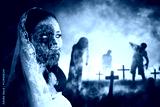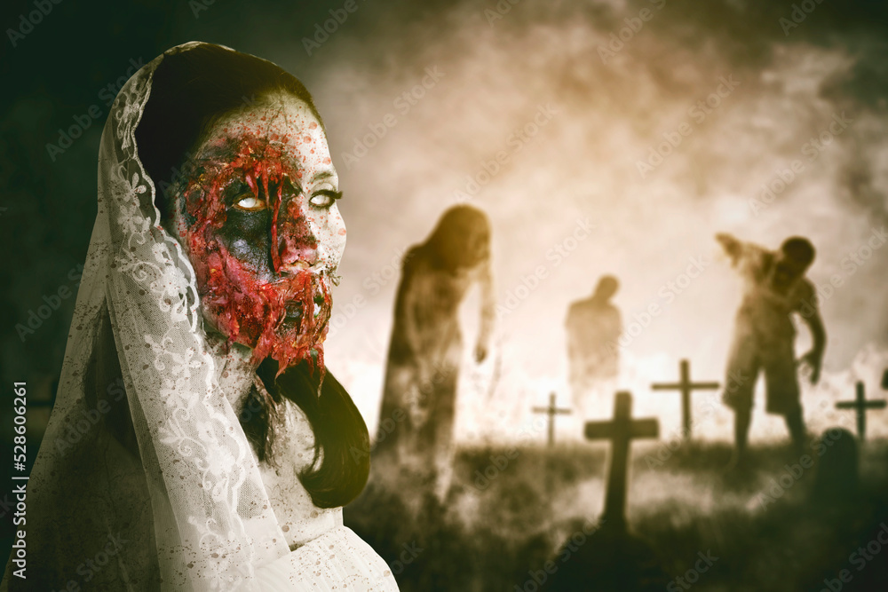 Group of spooky ghosts stand on burning graveyard