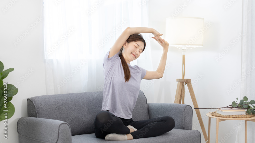 Beautiful Asian woman stretches out her arms on her favorite sofa in the living room, Body and mind health care, Relaxation through meditation, Healthy exercise, Quiet living room.