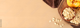 Bowl with natural pumpkin seeds on beige background with space for text, top view
