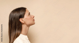 Caucasian female with long shiny hair with nude makeup in profile on a beige background