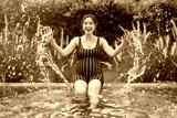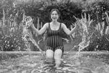 cheerful pregnant woman in swimsuit sitting on edge of swimming pool while playing water splashing