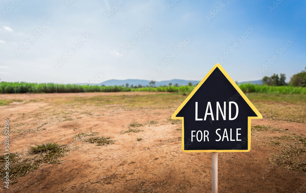 land for sale sign against trimmed lawn background. Empty dry cracked swamp reclamation soil, land plot for housing construction project in rural area and beautiful blue sky with fresh air.