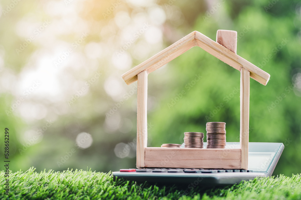 Coins placed is a staircase in a House is on the calculator placed on the grass. planning savings money of coins to buy a home concept for property, mortgage and real estate invest to buy a house.