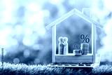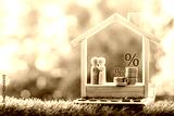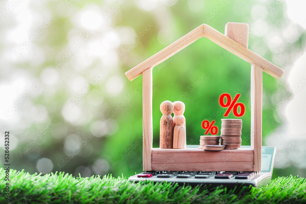 Wooden house with a a pile of money with interest rates and wooden dolls a happy family is placed inside on nature bokeh. Property investment and Interest rate financial and mortgage rates concept.