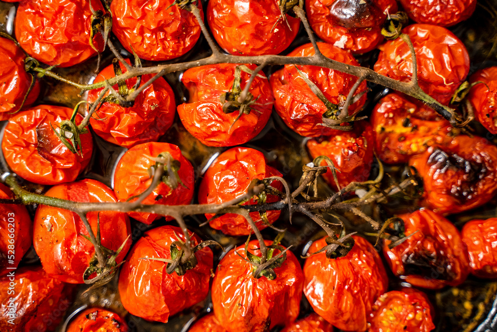 Close up shot of roasted red cherry tomatoes with garlic, herbs and olive